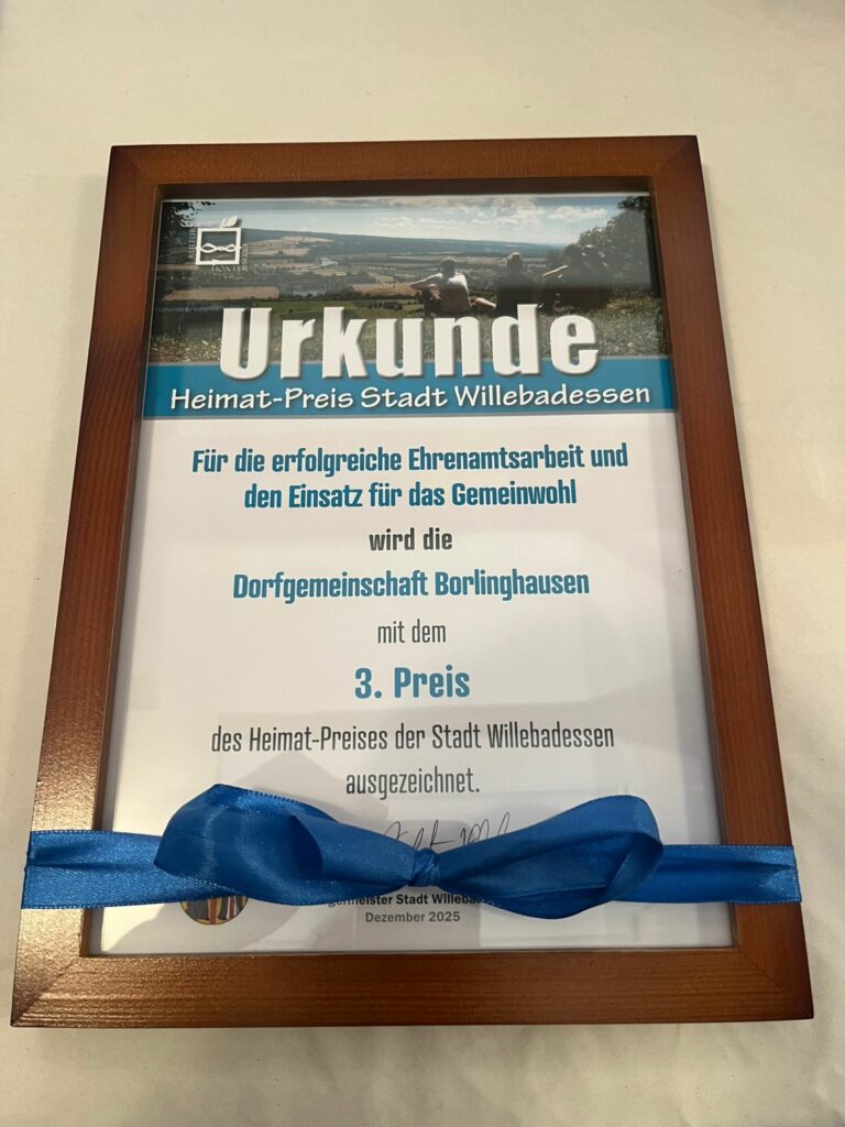 Im Rahmen der vierten Ehrenamtsfeier der Stadt Willebadessen wurde die Ortsgemeinschaft Borlinghausen mit dem 3. Platz ausgezeichnet. Als Anerkennung für das herausragende ehrenamtliche Engagement erhielt die Dorfgemeinschaft eine Urkunde sowie ein Preisgeld.
